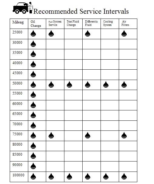 See our great visual below as a general guide on when you should preform fluid and air filter changes. Always check your owners manual to see when certain services and maintenance should be preformed. If your not aware it is easy to be talked into services that can easily damage your car or just simply not be necessary.